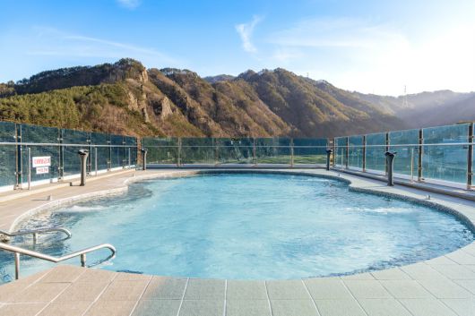 4층으로 올라가면 겨울 온천의 정점인 야외 자쿠지 풀이 기다린다. 영하의 찬 공기 속에서도 수온은 34~35도를 일정하게 유지한다. 물속에 몸을 누이면 유황 온천 특유의 미끌미끌한 촉감이 비단처럼 피부를 감싼다. 머리 위로는 산촌의 맑고 찬 공기가 내려앉고, 장엄한 태백산맥의 능선이 시야 가득 웅장하게 자리한다. 뜨거운 온기와 서늘한 공기, 그리고 자연의 압도적인 위용. 시린 마음을 녹이기에 이보다 더 확실한 처방은 없다.