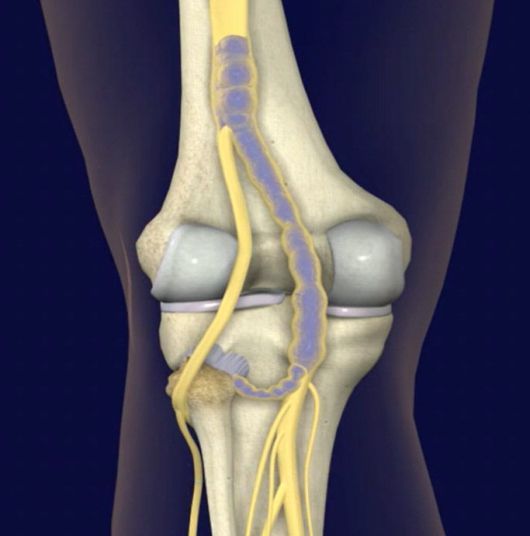 무릎 주변을 지나는 비골·경골신경에 신경내 결절종이 발생한 모습. 메이요 클리닉 |
