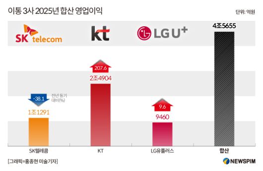 17일 에프엔가이드에 따르면 이통 3사의 2025년 합산 영업이익은 4조 5655억원에 이를 것으로 예상된다. 기업별로는 SK텔레콤 1조 1291억원, KT 2조 4904억원, LG유플러스 9460억원이다. 전년 대비 SKT는 38.1% 감소했으나 KT는 207.6%, LG유플러스는 9.6% 증가한 수치다.