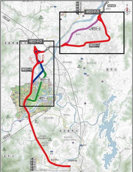 국토부가 15일 공고한 ‘충청권광역급행철도 민간투자사업 전략 및 환경영향평가 항목 등의 결정내용 공개’에서 제시된 대안노선 위치도. 국토부 홈페이지 캡처 |