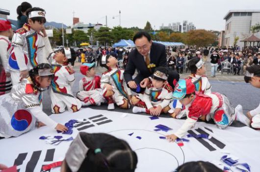 윤병태 나주시장과 아이들이 태극기 만들기 체험을 함께하고 있다. 나주시 제공 |