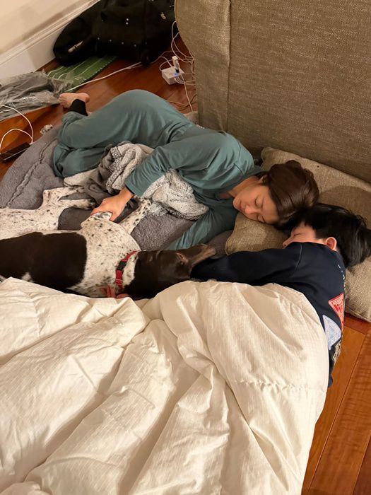 사진에서 이지현은 자신보다 큰 강아지를 안고 잠을 자고 있다. 이지현은 “철통 교육으로 소파나 침대를 절대 올라오지 않아서 아들이랑 안아서 올리려다가 힘이 얼마나 좋은지. 절대 올라오지 않는 똑똑이. 같이 자고 싶은 우리가 개집으로”라고 설명했다.