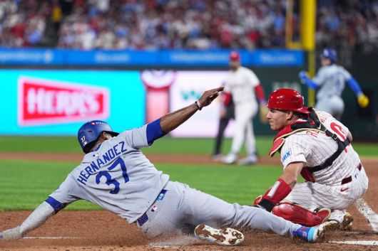 [필라델피아=AP/뉴시스] 로스앤젤레스(LA) 다저스의 테오스카 에르난데스가 6일(현지 시간) 미 펜실베이니아주 필라델피아 시티즌스 뱅크 파크에서 열린 2025 메이저리그 내셔널리그 디비전시리즈(NLDS·5전3선승제) 2차전 필라델피아 필리스와의 경기 7회 초 엔리케 에르난데스의 야수 선택 땅볼에 홈을 파고들고 있다. 2025.10.07. |