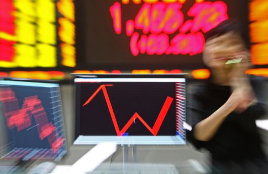 서울 여의도 한국거래소 전광판이 코스피 지수의 급등락을 보여주는 가운데, 거래소 직원이 전화 통화를 하는 모습. 연합뉴스 |