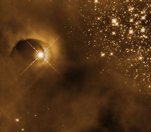 이 원시별에서 분출된 제트와 항성풍이 주변 가스와 먼지 구름에 커다란 구멍을 만들어냈다. 오른쪽 위 대각선 방향으로 뻗어 있는 것은 이 원시별이 분출한 제트다. 제트는 원시별의 자기 극에서 매우 빠른 속도로 방출된 입자들로 이루어져 있다.