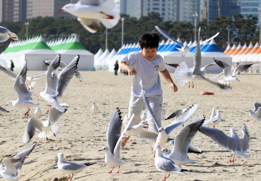 포근한 날씨를 보인 지난 16일 부산 해운대해수욕장에서 반팔 차림을 한 어린이가 갈매기의 군무를 보며 즐거운 시간을 보내고 있다. /뉴스1 |