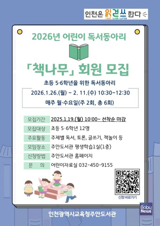 인천광역시교육청주안도서관(관장 최문정)은 예비 초등 5·6학년 학생을 대상으로 하는 독서동아리 「책나무」 회원을 모집한다고 16일 전했다.