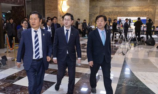 더불어민주당 정청래 대표(왼쪽)와 황명선 최고위원(오른쪽), 김동아 의원을 비롯한 의원들이 16일 국회에서 열린 2026년 1월 임시회 1차 본회의에서 2차 종합특검법을 처리한 뒤 본회의장을 떠나고 있다. 연합뉴스 |