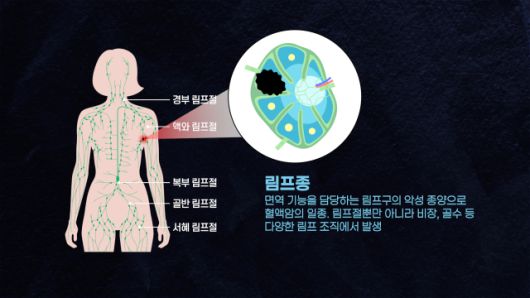 림프종은 우리 몸 면역체계의 핵심인 '림프구'에서 발생하는 혈액암이다. 림프구는 바이러스·세균·암세포를 인식하고 제거하는 ‘면역 병사' 역할을 하며 B세포, T세포, NK세포가 있다. 이들 면역세포가 암세포로 변해 림프종이 된다. 림프구는 우리 몸 곳곳에 퍼져있는 림프절을 포함해 혈액, 비장, 골수, 위·장, 폐, 피부 등 몸 곳곳에 존재하므로, 림프종은 우리 몸 다양한 곳에서 발생할 수 있다. <그래픽1>