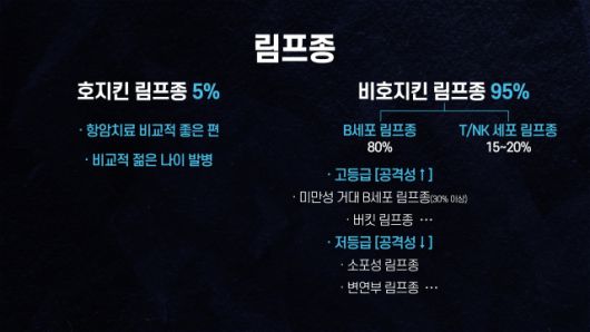 비호지킨 림프종은 다시 B세포 계열과 T세포, NK세포 계열로 나뉘며, B세포 림프종이 대략 80%로 다수를 차지한다. B세포 림프종 중에 가장 흔한 아형은 '미만성 거대 B세포 림프종'이다. <그래픽2>