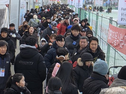 2026 화천산천어축제가 주말을 맞아 얼음낚시 티켓을 확보하기 위한 대기 줄이 길게 이어지는 진풍경이 펼쳐졌다.