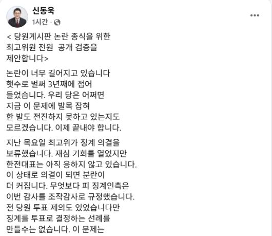 국민의힘 한동훈 전 대표가 이른바 당원게시판(당게) 사태로 윤리위에서 제명 처분을 받은 것을 놓고 당내 갈등이 계속되는 가운데 국민의힘 신동욱 최고위원이 당게 사태에 대한 최고위 차원의 공개 검증을 제안했다.