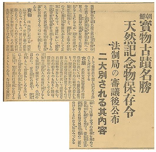 ▲ 조선보물명승천연기물보존령 공포 예정에 관한<경성일보>기사. ⓒ 대한민국 신문 아카이브 |