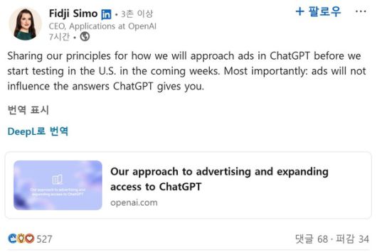 피지 시모 오픈AI 애플리케이션 부문 최고경영자(CEO)는 17일 자신의 링크드인 계정을 통해 "향후 몇주 내 미국에서 챗GPT에 광고를 도입한다"며 "광고는 챗GPT 답변에 영향을 미치지 않는다"고 밝혔다.