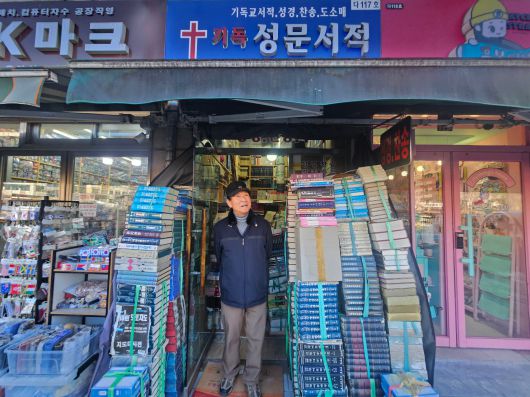 현 씨의 8.26㎡(약 2.5평) 남짓한 가게는 평생 모아온 수천 권의 책으로 빼곡했다. 그는 “수익이 전성기에 비해 80%나 줄었고, 요즘은 밥만 겨우 먹고 사는 수준”이라고 털어놨다. 입학·졸업 시즌인 연말연시는 대목이어야 하지만, 코로나 이후 작은 교회들이 사라지고 독서 인구마저 줄면서 매출은 곤두박질쳤다.