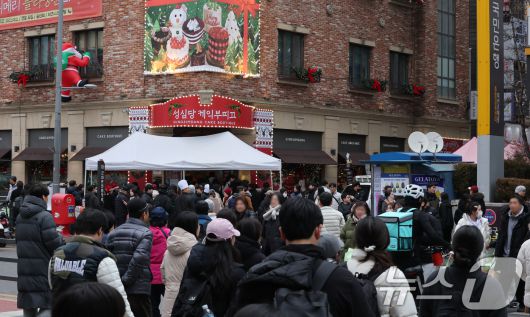 크리스마스를 이틀 앞두고 딸기시루가 출시된 23일 대전 중구 성심당 일대에 빵을 사려는 고객들이 차례를 기다리고 있다. 2025.12.23/뉴스1 ⓒ News1 김기태 기자 |