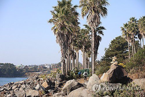 (제주=연합뉴스) 고성식 기자 = 17일 겨울치고는 기온이 올라 따뜻한 날씨 속에 제주 서귀포시 올레길에서 올레꾼들이 탐방을 즐기고 있다. 2026.1.17.