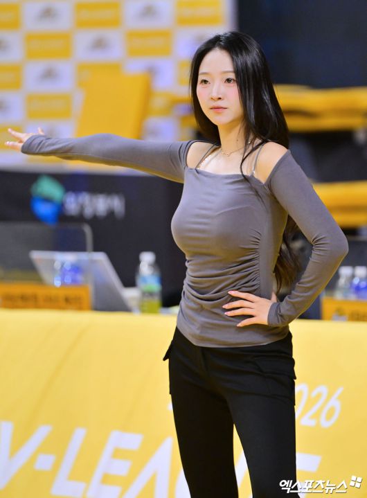 (엑스포츠뉴스 의정부, 김한준 기자) 16일 오후 경기도 의정부실내체육관에서 열린 '진에어 2025-2026 V-리그' KB손해보험과 대한항공의 경기, 이연진 치어리더가 리허설에 임하고 있다.