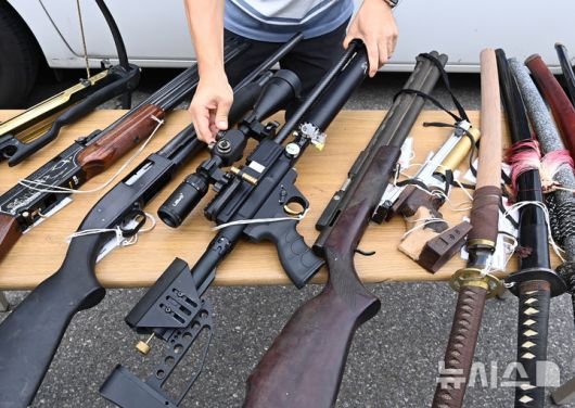 [수원=뉴시스] 김종택 기자 = 불법무기류 자진신고 기간인 2일 경기도 수원남부경찰서 범죄예방질서계 관계자들이 보관중인 총기류 등을 살펴보고 있다. 이번 자진신고 대상은 허가 없이 소지하고 있거나, 소지 허가가 취소된 총기, 화약류(화약·폭약·실탄·포탄), 도검, 분사기, 전자충격기, 석궁 등이다. 2024.09.02. jtk@newsis.com |