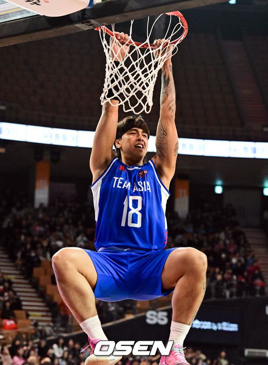 [OSEN=잠실실내체, 조은정 기자] 17일 서울 송파구 잠실실내체육관에서 2025-2026 LG전자 프로농구 올스타전 전야제가 열렸다. 이번 올스타전은 2015-2016시즌 이후 10년 만에 잠실실내체육관에서 열리는 경기이자, 해당 체육관 철거 전 마지막으로 열리는 올스타전이다. 팀아시아 구탕이 덩크를 성공하고 있다. 2026.01.17 /cej@osen.co.kr