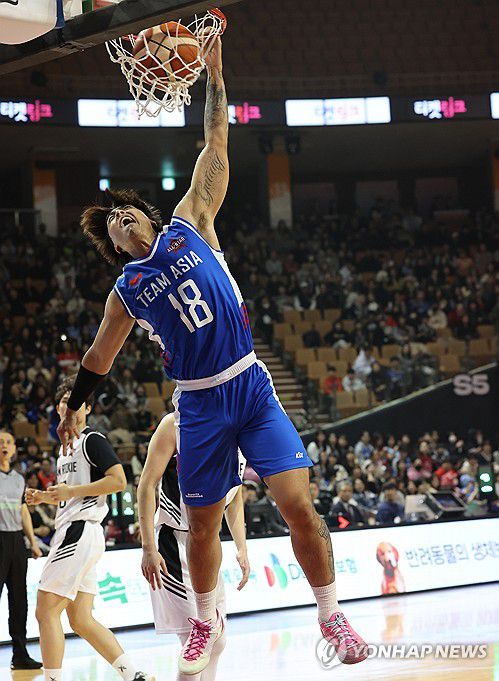 (서울=연합뉴스) 서명곤 기자 = 17일 서울 송파구 잠실실내체육관에서 열린 2025-2026 LG전자 프로농구 올스타전 전야제 팀루키와 팀아시아의 경기. 팀아시아 저스틴 구탕이 슛을 하고 있다. 2026.1.17