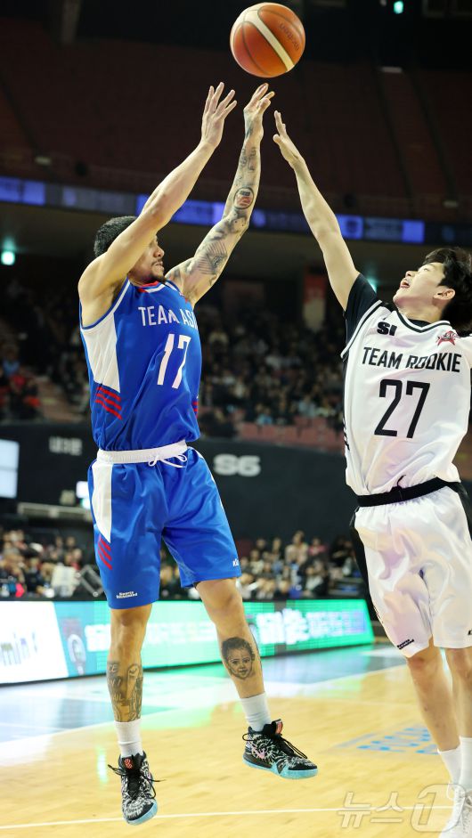 (서울=뉴스1) 김진환 기자 = 17일 오후 서울 송파구 잠실실내체육관에서 열린 2025-2026 LG전자 프로농구 올스타전 전야제 팀 아시아와 팀 루키의 경기, 팀 아시아 이선 알바노가 팀 루키 양우혁의 수비 앞에서 미드레인지 점퍼를 던지고 있다. 이번 올스타전은 지난 2015-2016시즌 이후 10년 만에 잠실실내체육관에서 열리는 경기이자, 해당 체육관 철거 전 마지막으로 열리는 올스타전이다. 2026.1.17/뉴스1