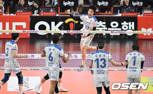 [OSEN=부산, 이석우 기자] 17일 부산 강서실내체육관에서 진에어 2025-2026 V리그 남자부 OK저축은행과 삼성화재의 경기가 열렸다.