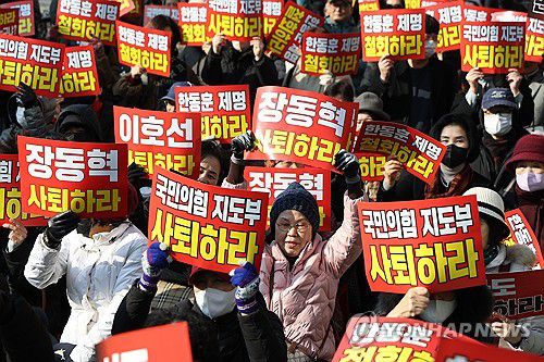 장 대표측과 친한계간 공방이 계속되는 가운데 한 전 대표 지지자 수백 명은 국회의사당역 앞에서 집회를 열고 한 전 대표 징계 취소를 촉구했다.