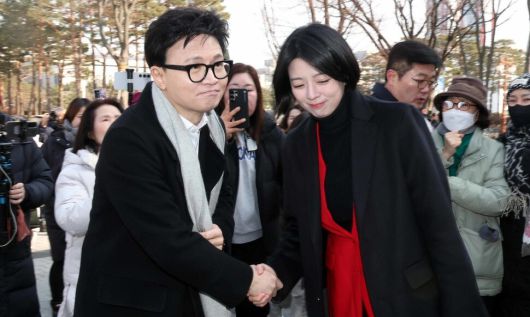 한동훈 전 국민의힘 대표가 지난 14일 당 윤리위원회가 본인을 제명 결정한 것과 관련해 입장을 밝히기 위해 국회 소통관으로 향하며 배현진 의원과 악수를 하고 있다. 공동취재사진 |