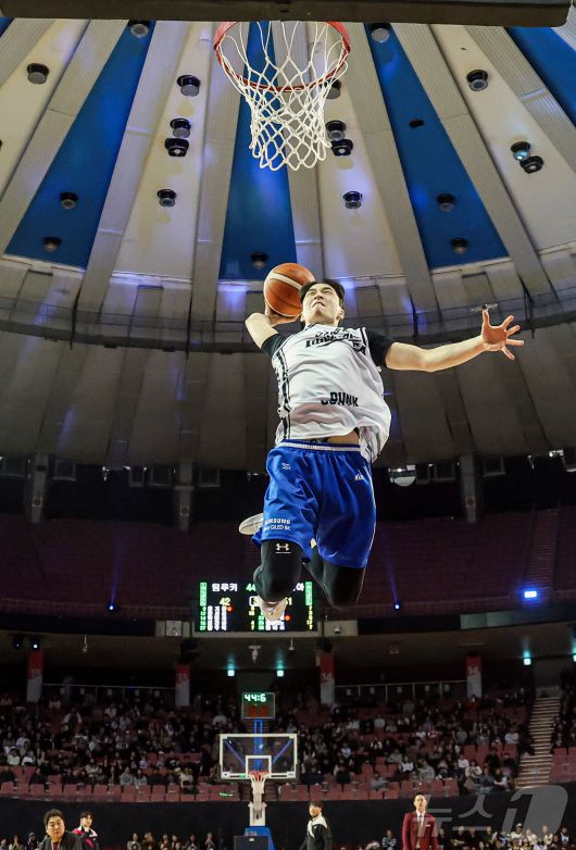 (서울=뉴스1) 김진환 기자 = 17일 오후 서울 송파구 잠실실내체육관에서 열린 2025-2026 LG전자 프로농구 올스타전 전야제 덩크 콘테스트에서 서울 삼성 조준희가 호쾌한 덩크슛을 하고 있다. 이번 올스타전은 지난 2015-2016시즌 이후 10년 만에 잠실실내체육관에서 열리는 경기이자, 해당 체육관 철거 전 마지막으로 열리는 올스타전이다. 2026.1.17/뉴스1