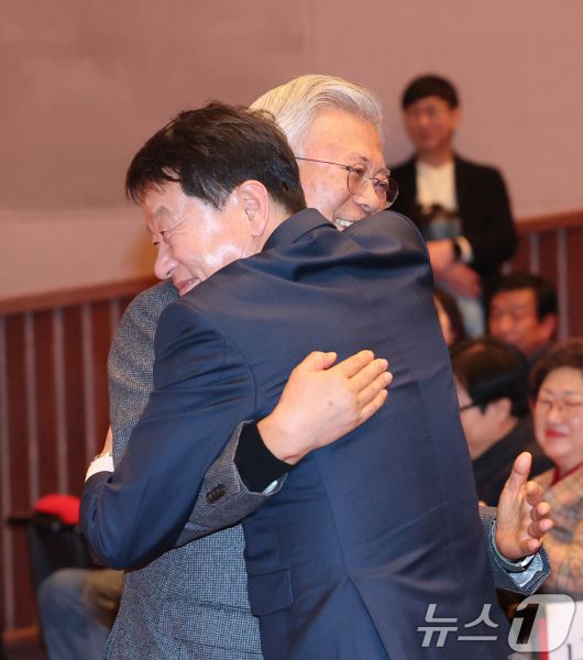 (대전=뉴스1) 김기태 기자 = 문재인 전 대통령이 17일 대전 서구 배재대에서 열린 김한수 전 배재대 부총장 출판기념회에 참석해 김 전 부총장과 포옹하고 있다. 2026.1.17/뉴스1presskt@news1.krCopyright ⓒ 뉴스1. All rights reserved. 무단 전재 및 재배포, AI학습 이용 금지.