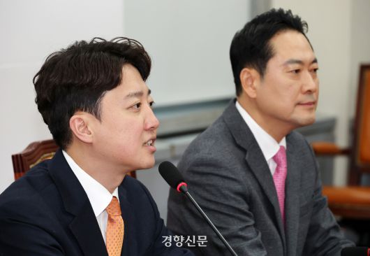 이준석 개혁신당 대표(왼쪽)가 지난 13일 국회 국민의힘 당대표회의실에서 장동혁 국민의힘 대표와 회동에서 발언하고 있다. 박민규 선임기자 |
