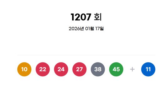 로또복권 운영사 동행복권은 제1207회 로또복권 추첨에서 ‘10, 22, 24, 27, 38, 45’가 1등 당첨번호로 뽑혔다고 17일 밝혔다. 2등 보너스 번호는 ‘11’이다.