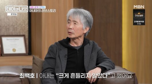 17일 방송된 MBN 예능 '김주하의 데이앤나잇'에는 올해 데뷔 50주년 맞은 가수 최백호가 게스트로 출연했다. 이날 최백호는 "이태원에서 노래하고 있었는데 친한 지인이 부인과 또 다른 여성을 데리고 왔다. 지인 부인의 처제라고 하더라"라며 아내와의 첫만남 당시를 떠올렸다.