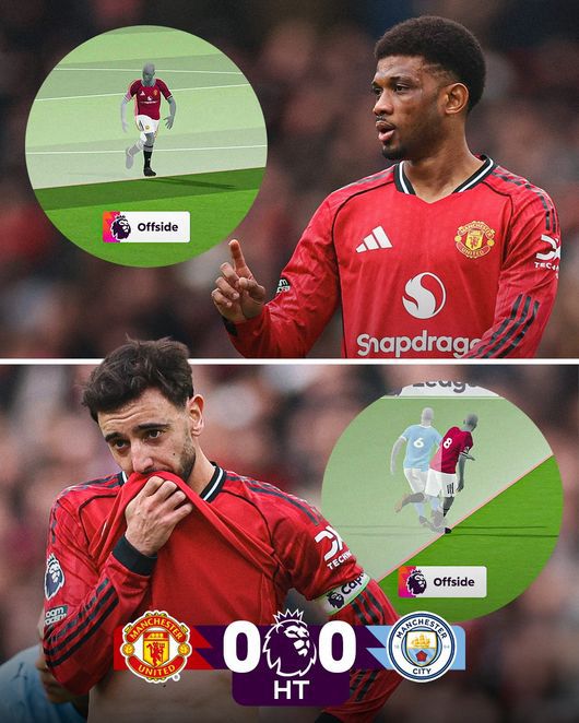 또 오프사이드로 맨유의 선제골이 취소됐다. 전반 40분 브루노가 리산드로의 패스를 받아 수비 라인 뒤로 빠져나갔다. 완벽한 일대일 기회를 잡은 그는 골키퍼에 이어 수비까지 침착하게 지치고 골문 안에 밀어넣었지만, 이번에도 오프사이드가 선언됐다. 결국 전반은 득점 없이 끝났다.
