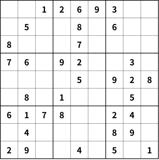 ※ 스도쿠 규칙: 숫자 1~9를 ①세로 9칸에 한 번씩만 써서 채운다. ②가로 9칸에도 한 번씩만 써서 채운다. ③굵은 선의 작은 사각형 3칸×3칸에도 한 번씩만 써서 채운다.