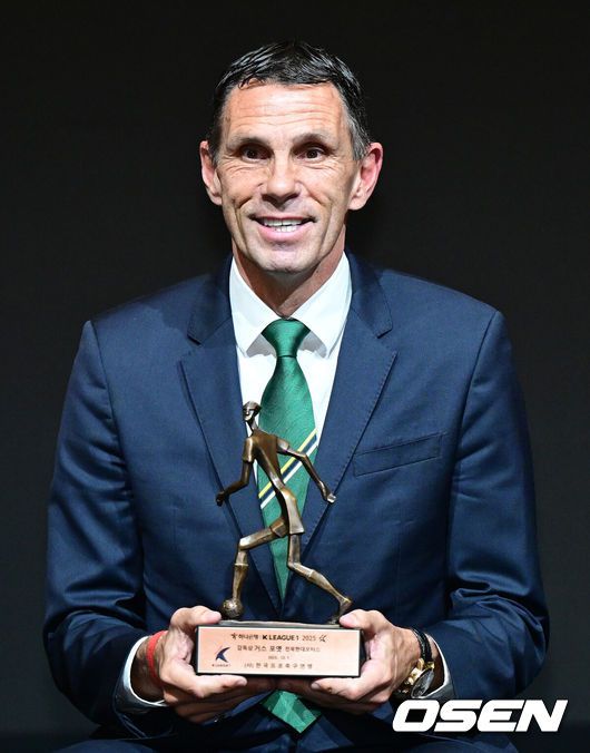 [OSEN=최규한 기자] 1일 오후 서울 홍은동 스위스 그랜드 호텔에서 ‘K리그 어워즈 2025’ 시상식이 열렸다.이날 시상식에는 최우수감독상, 최우수선수상(MVP), 영플레이어상, 베스트11 부문에 뽑힌 각 구단 수상자들과 후보들이 자리를 빛냈다.K리그1 감독상을 거머쥔 전북 거스 포옛 감독이 트로피와 함께 포즈를 취하고 있다. 2025.12.01 / dreamer@osen.co.kr |