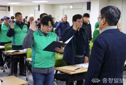 새마을지도자 충주시협의회 회원들이 16일 총회에서 청렴 실천 서약을 하고 있다. |