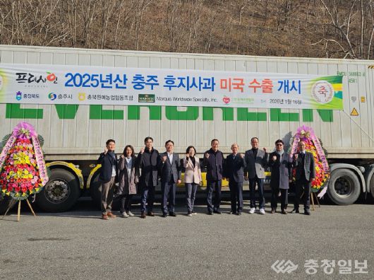 충주시는 16일 충북원예농협 충주거점산지유통센터에서 2025년산 충주사과 5.5t 미국 수출 선적식을 가졌다.
