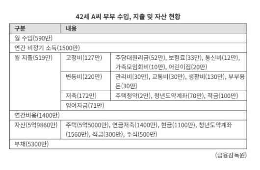 42세 A씨 부부 월 수입은 590만원이다. 연간 비정기 수입은 1500만원이다. 월 지출은 519만원이다. 고정비는 주담대원리금(52만원), 보험료(33만원), 통신비(12만원), 가족모임회비(10만원), 어린이집(20만원) 등 127만원이다. 변동비는 관리비(30만원), 교통비(30만원), 생활비(130만원), 부부용돈(30만원) 등 220만원이다. 저축은 주택청약(2만원), 청년도약계좌(70만원), 적금(100만원) 등 172만원씩 하고 있다. 이를 제외하고 남는 자금은 71만원이다. 연간 비용은 1400만원이다. 자산은 주택(5억5000만원), 연금저축(1400만원), 현금(1100만원), 청년도약계좌(1560만원), 적금(300만원), 주식(500만원) 등 총 5억9860만원이다. 부채는 5300만원이 있다.