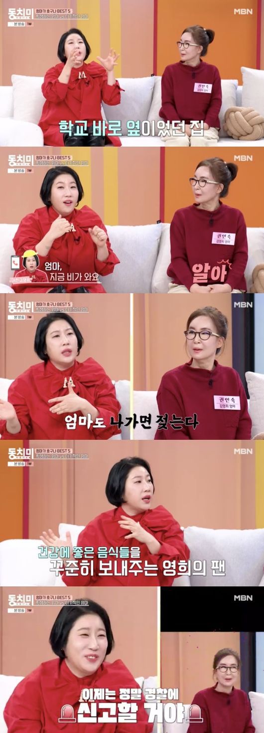 김영희는 “비 오면 학교 앞에 우산 들고 오는 사람들이 엄마가 아닌 줄 알았다. 우리 엄마는 절대 안 오니까. 심지어 집이 근처였다. 너무 당황해서 공중전화로 전화해서 ‘비가 와요’ 하면 ‘알아’ 한다”라고 말했다.