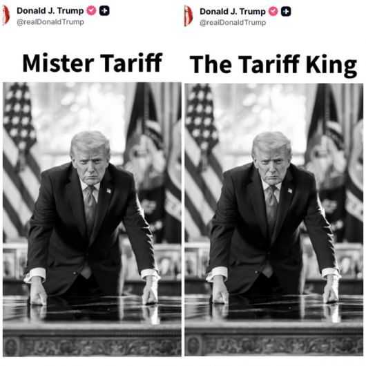 도널드 트럼프 미국 대통령이 백악관 집무실 책상 위에 주먹을 쥔 양손을 올린 채로 정면을 응시하는 흑백 사진과 함께 "관세 왕"(The Tariff King), "미스터 관세"(Mister Tariff)라는 문구가 담긴 본인 사진을 공개했다.