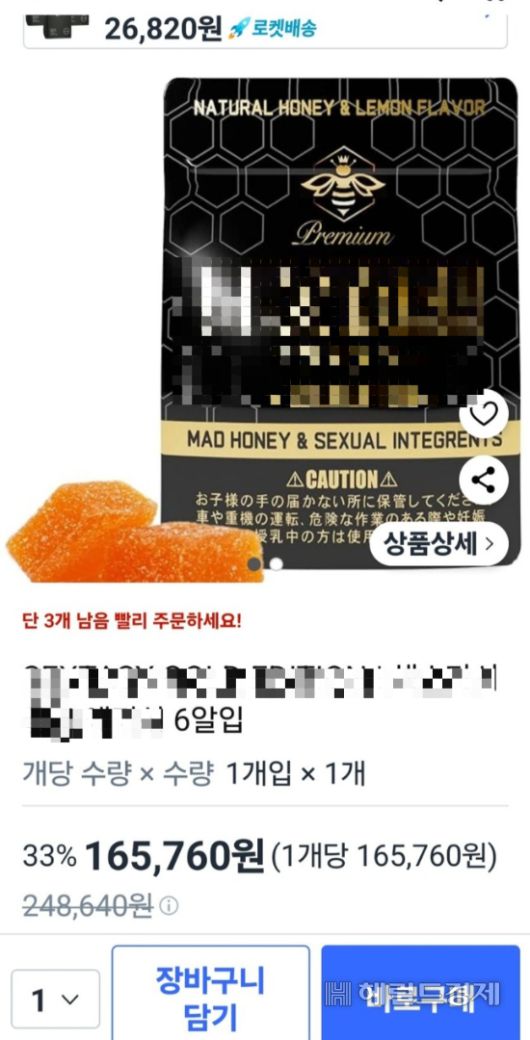 [헤럴드경제=이영기·박준규 기자] 국내에서 엄격한 기준에 따라 유통돼야 하는 대마 추출물이 함유된 일본의 마약젤리 식품이 쿠팡의 판매 목록에 버젓이 올라왔던 것으로 확인됐다. 해당 제품은 해외 직구를 통해서도 국내에서 구매할 수 없는 제품으로, 성기능 개선 효과가 있는 것으로 홍보되는 일본 식품이다. 대마(헴프) 성분으로 일본 내에서도 규제 논의가 진행되고 있다.