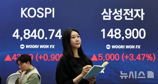 [서울=뉴시스] 최진석 기자 = 코스피가 전 거래일(4797.55)보다 43.19포인트(0.90%) 상승한 4840.74에 마감한 16일 서울 중구 우리은행 딜링룸에 종가가 보이고 있다. 이날 삼성전자는 0.42% 오른 14만4500원에 거래를 시작했다. 주가는 장초 가파른 상승세를 이어가며 오전 10시58분께 3.89% 14만9500원을 터치하며 52주 신고가를 경신했다. 전장 대비 3.47% 오른 14만8900원에 거래를 마쳤다. 2026.01.16. myjs@newsis.com |