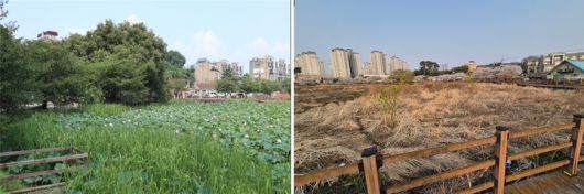[광주=뉴시스] 연꽃 명소로 주민들의 사랑을 받았던 광주 광산구 수완1저수지 과거 모습(왼쪽)과 퇴적물이 쌓여 토사와 잡초에 가려진 현재 모습(오른쪽). (사진=광주 광산구 제공) 2026.01.18. photo@newsis.com *재판매 및 DB 금지 |