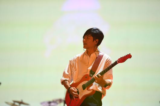 고(故) 안성기 출연의 영화 ‘실미도’를 뮤직비디오로 쓴 록 오페라 ‘태양의 눈’이 시작되면 객석의 온도는 달라진다. 태양처럼 새빨간 기타를 멘 그가 중저음의 기름진 톤으로 쏟아내는 아찔한 멜로디는 가왕의 또 다른 목소리다. 기타 솔로와 함께 클라이맥스로 내달리면 객석의 도파민은 한도 초과로 치솟는다.