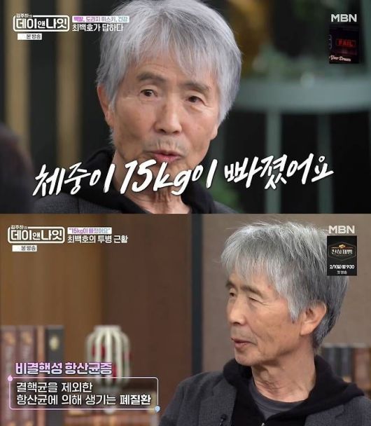 최백호는 17일 방송한 MBN '김주하의 데이앤나잇'에서 비결핵성 항산균증으로 투병했다고 고백했다. 결핵균을 제외한 항산균에 의해 발생하는 폐 질환이다. "건강이 좀 안 좋았다"며 "건강검진에서 까다로운 질병이 발견, 체중이 15㎏이나 빠졌다. 원래 70㎏이었는데 지금은 55㎏밖에 안 된다"고 털어놨다.