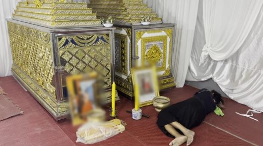 딸과 한국인 사위 관 앞에서 슬픔에 잠겨 누워있는 60대 태국인 여성. /MCOT