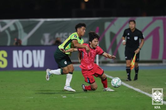 (서울=뉴스1) = 김용학이 18일(한국시간) 사우디아라비아 제다 킹 압둘라 스포츠시티홀 스타디움에서 열린 호주와의 2026 아시아축구연맹(AFC) U23 아시안컵 8강전에서 볼다툼을 벌이고 있다. (대한축구협회 제공. 재판매 및 DB 금지) 2026.1.18/뉴스1