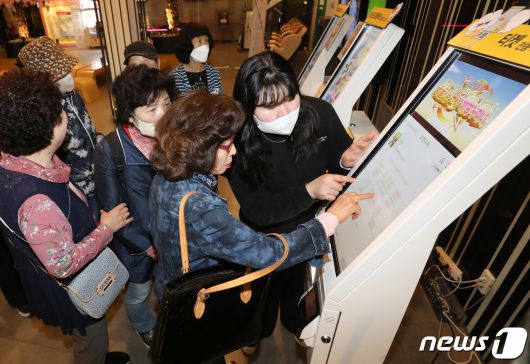 27일 오전 대구의 한 영화관에서 현장체험활동을 나온 대구내일학교 늦깎이 학습자들이 무인티켓판매기(키오스크) 사용법을 배운 뒤 직접 영화 티켓을 발권하고 있다.2023.4.27/뉴스1 ⓒ News1 공정식 기자 |